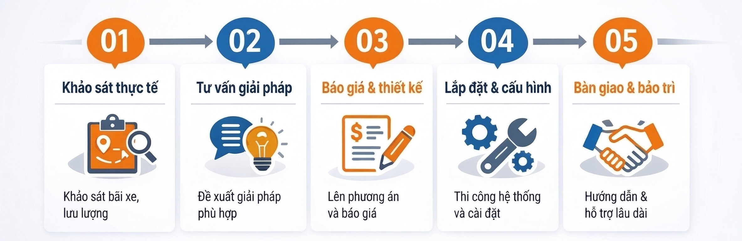 Giải pháp kiểm soát bãi xe bằng thẻ từ, QR Code, Face ID & nhận diện biển số. Giúp giảm thất thoát, tăng tốc độ vận hành và quản lý tập trung.